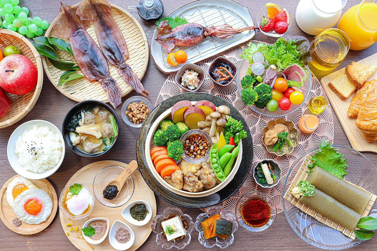 佐渡島・新潟県の恵みをふんだんに取り入れた、地産地消の朝食。